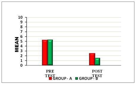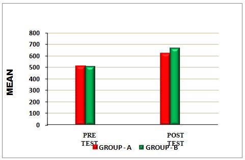 The above table reveals the Mean, Standard Deviation (S.D), t-value and p-value between pre-test and post-test within Group – A &Group – B. There is a statistically highly significant difference between the pre test and post test values within Group A and Group B(***- P ≤ 0.001).
