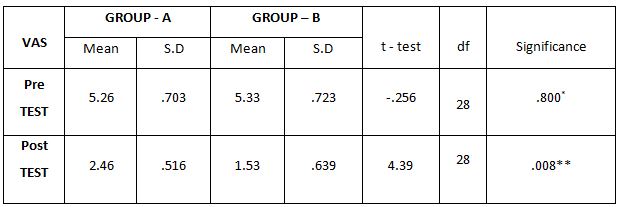 Table-1. Comparison of Visual Analog Scale Score between Group – A and Group – B in Pre and Post Test