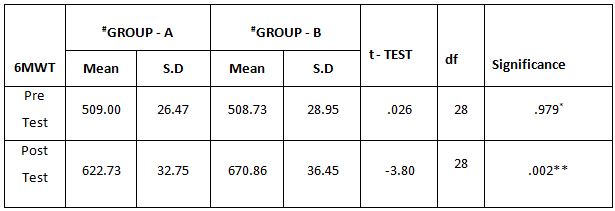 Table-2. Comparison of 6 Minute Walk Test between Group – A and Group – B in Pre and Post Test