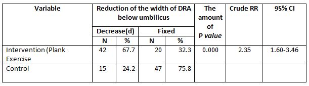 Postpartum women who did Plank Exercise had a 2.3 times chance of experiencing a reduction in the width of the DRA below umbilicus compared to those who did not do it (p value =0.000; cRR=2.35;95%CI= 1.60-3.46).