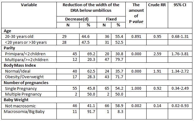 The results of cross tabulation showed that postpartum women who gave birth to babies weighing 4000 grams mostly experienced a reduction in the width of the DRA below the umbilicus was 11 people (91.7%). Meanwhile, postpartum women with babies weighing <4000 grams mostly did not experience a reduction in the width of the DRA below umbilicus (fixed) was 66 people (58.9%). Chi Square test results showed that there was a relationship between large baby weight and a reduction in the width of the DRA below umbilicus (p value <0.05). Postpartum women with not macrosomic babies were 0.1 times more likely to experience a reduction in the width of the DRA below umbilicus compared to women with macrosomic babies (p value=0.002; CRR=0.14;95%CI=0.02-0.93).